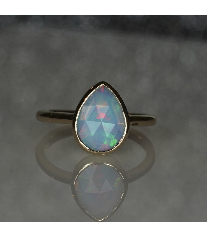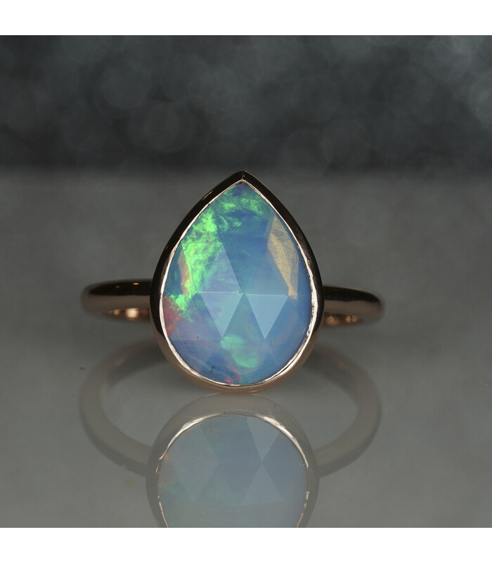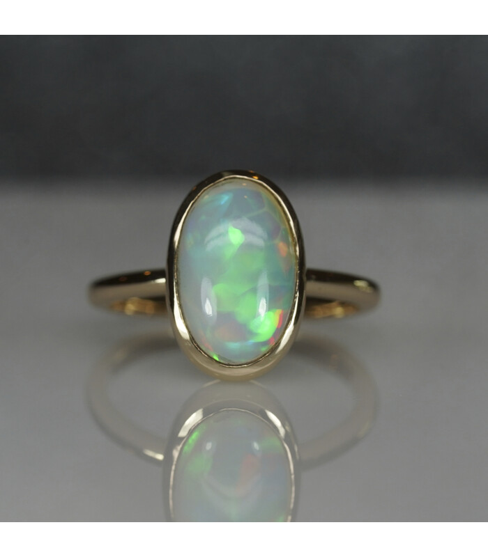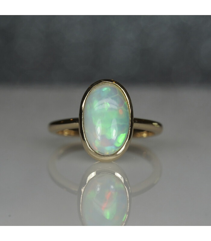 These rings are in 14k, we made a mix of gold colors and finishes - highpolish and satin. We set some East-West, some North-South. 2-3 grams of gold in each ring and the opals are very spready - the longest dimension is around 10mm long on these, with some variance larger and smaller possible.